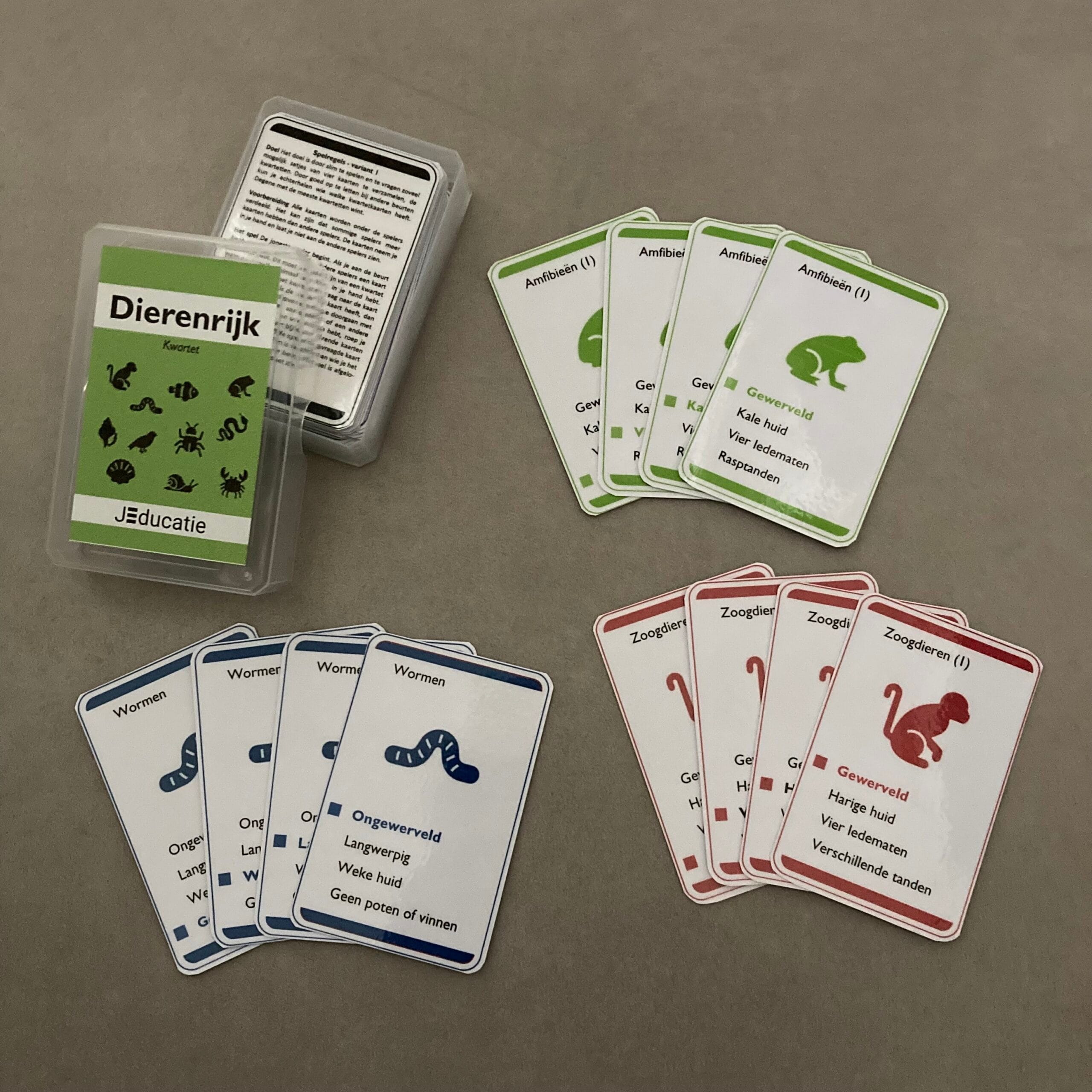 Met 52 speelkaarten en 13 verschillende kwartetten is dit spel geschikt voor 2 tot 4 spelers voor kinderen vanaf groep 5. Maak al spelenderwijs kennis met gewervelde en ongewervelde dieren, leer het verschil tussen de stammen in het dierenrijk en kom van alles te weten over zoogdieren, vogels, reptielen, amfibieën, vissen, spinnen, insecten, kreeftachtigen, duizendpoten, slakken en schelpdieren.
